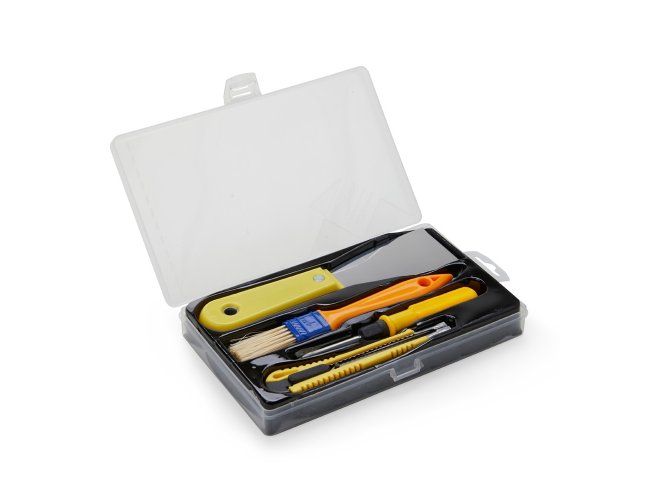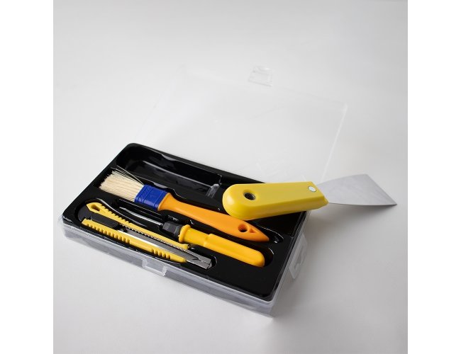 Kit ferramentas 4 peças em estojo plástico com trava de segurança. Contém chave dupla(Phillips e Fenda), estilete, pincel e espátula.