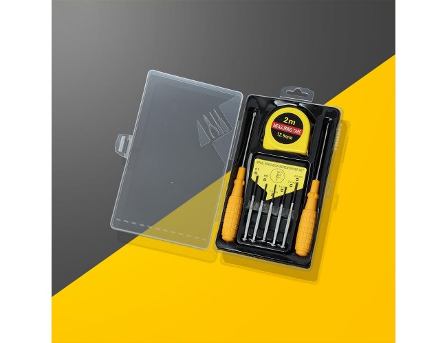 Kit ferramenta 8 peças em estojo plástico com trava de segurança. Contém chave Phillips, trena de 2 metros com trava, conjunto de 5 chaves de precisão e chave de fenda.
