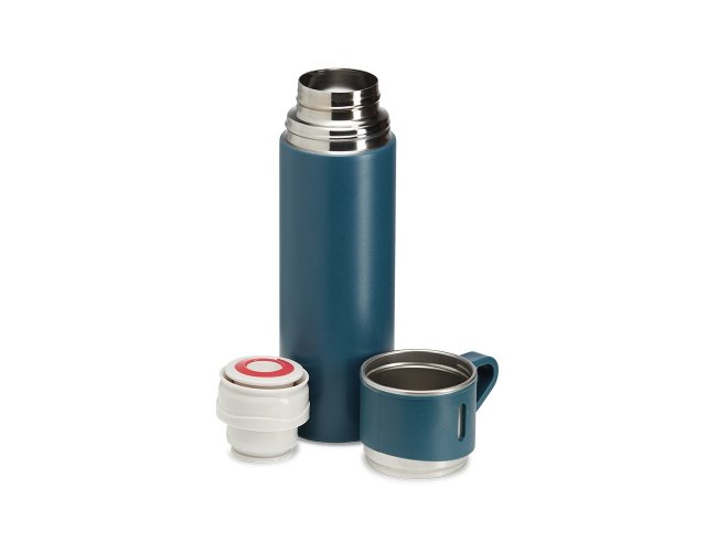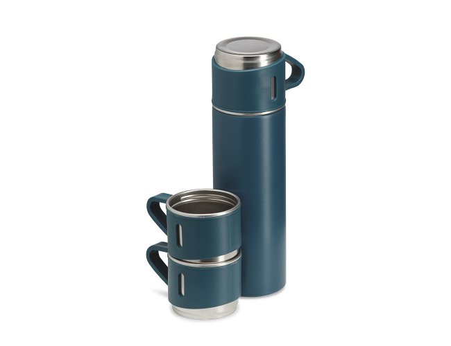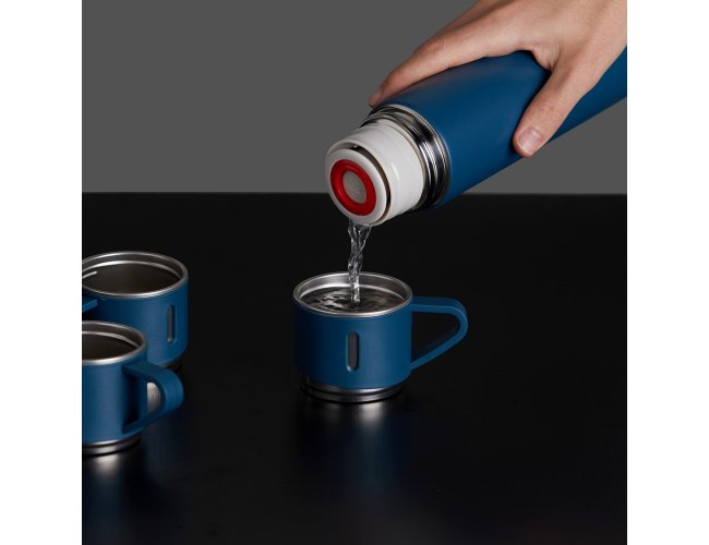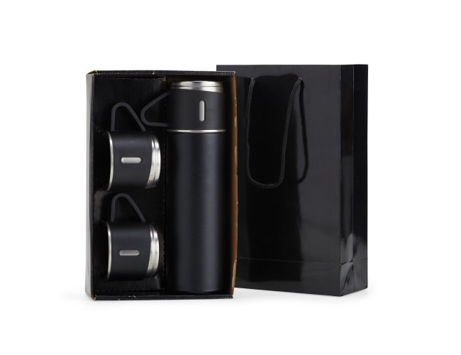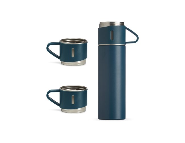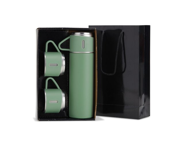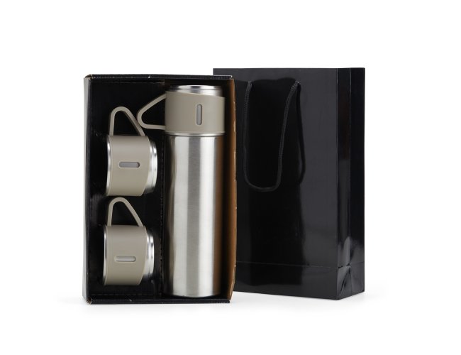 Kit garrafa térmica 450ml com duas tampas extras que podem ser utilizadas como xícaras. Garrafa produzida em inox com base antiderrapante e tampas de inox com revestimento plástico. Acompanha sacola de papel com berço de papelão para acomodação das peças.