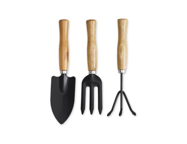 Kit jardinagem 3 peças composto por pazinha larga, garfo e ancinho metálicos com cabo de madeira. Obs.: podem haver alterações nas tonalidades das madeiras.