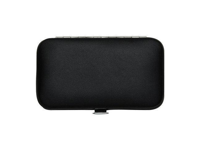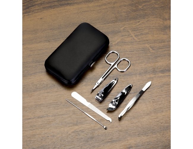 Kit manicure 6 peças em estojo de couro sintético. Possui: lixa, pinça, espátula para ouvido, cortador de cutícula, tesoura e cortador de unha. Parte interna de plástico com suporte de couro para fixar as peças. Para abrir o estojo basta apertar o botão central.