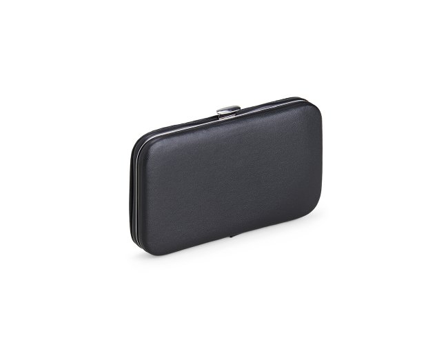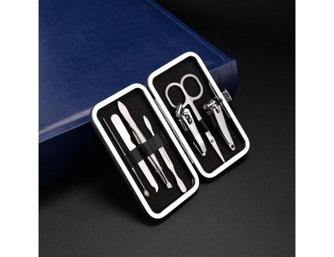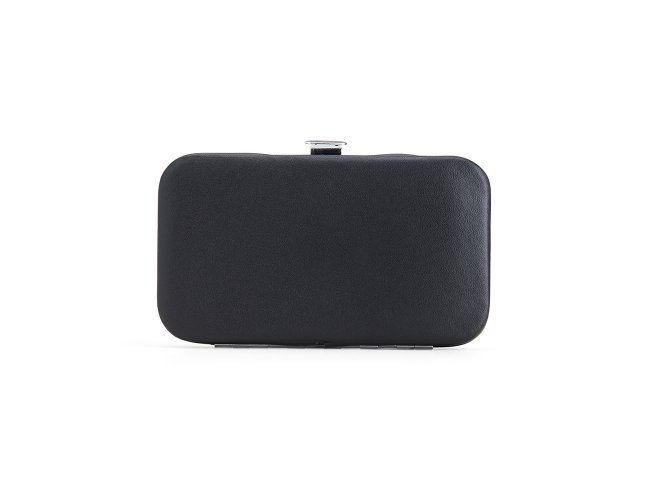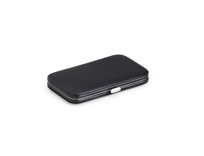 Parte interna de TNT com suporte de couro sintético para fixar as peças. Para abrir o estojo basta apertar o botão central. Kit manicure 7 peças em estojo de couro sintético. Possui: dois cortadores de unhas, tesoura, lixa, pinça, empurrador de cutícula e espátula para ouvido.