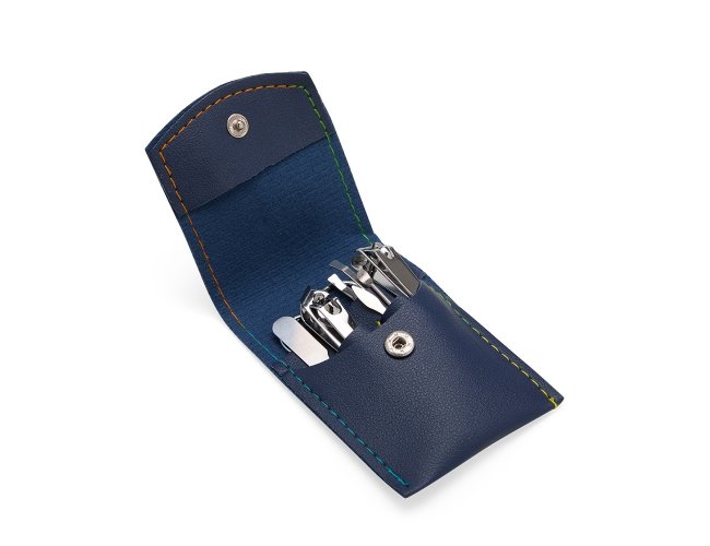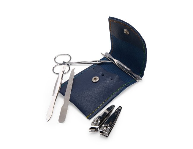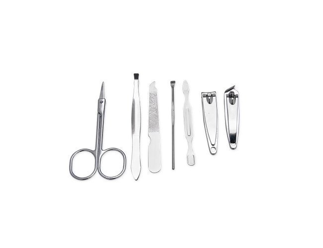 Kit manicure 7 peças em estojo de couro sintético. Contém: tesoura, 2 cortadores de unha, pinça, lixa, empurrador de cutícula e espátula para ouvido.