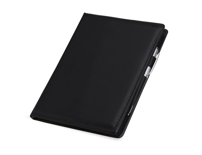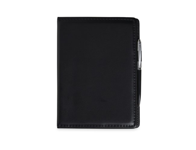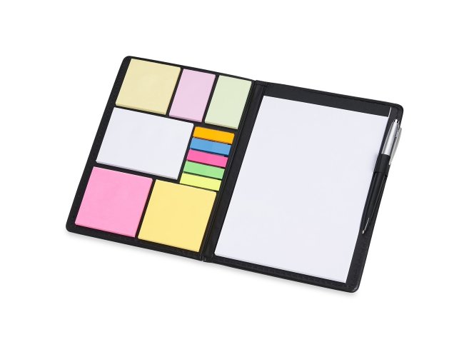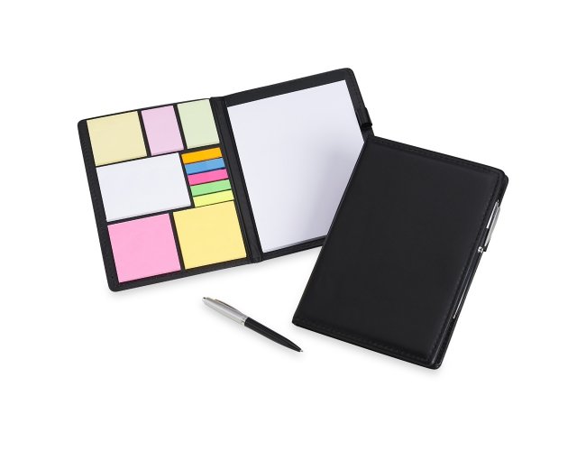 Kit para anotações em couro sintético com autoadesivos e caneta plástica. Contém seis blocos com aproximadamente 50 folhas, conjunto de cinco marcadores plásticos autoadesivos com aproximadamente 26 folhas, bloco A5 com aproximadamente 50 folhas e caneta esferográfica com carga azul e acionamento por clique.