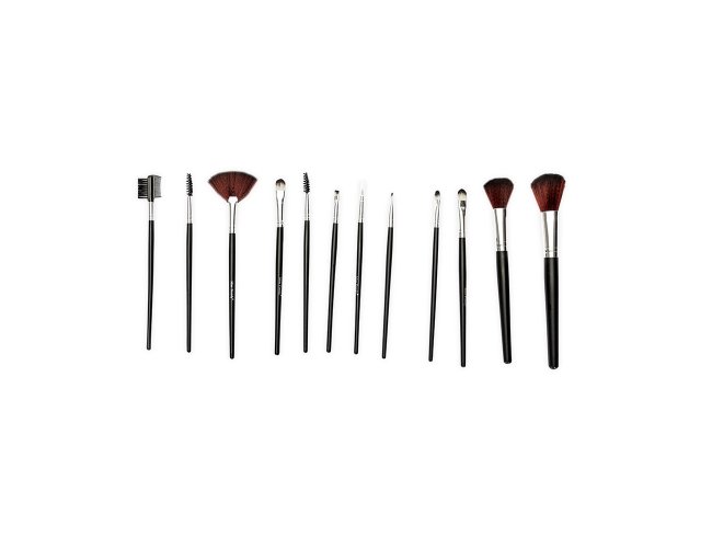 Kit de pincéis de maquiagem com cabos em MDF e cerdas sintéticas macias. O conjunto conta com 12 pincéis para diversas funções, incluindo dois pentes-escovas para cílios, além de pincel para base, corretivo, delineador e sombra. Acompanha nécessaire dobrável com bolso interno em tela de nylon e fechamento por botões magnéticos.