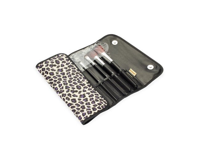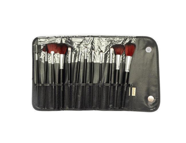 Kit formado por 12 pincéis de maquiagem cerdas sintéticas macias e cabo feito em MDF. O conjunto inclui um pente-escova para cílios e sobrancelhas, além de pincéis para base, corretivo, delineador e batom líquido. Acompanha nécessaire dobrável com bolso interno em tela de nylon e fechamento por botões magnéticos.