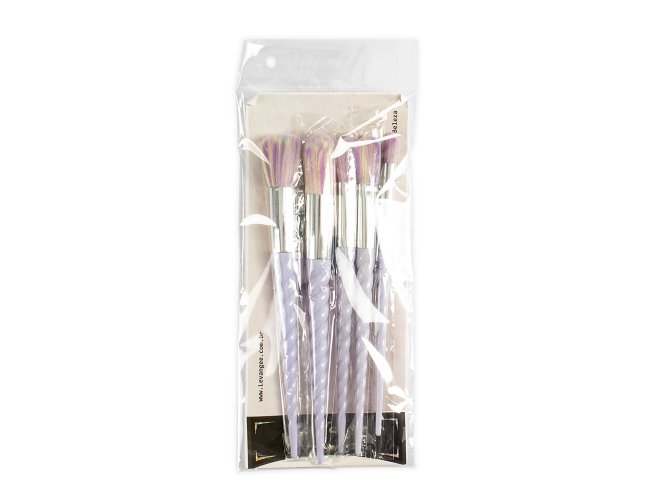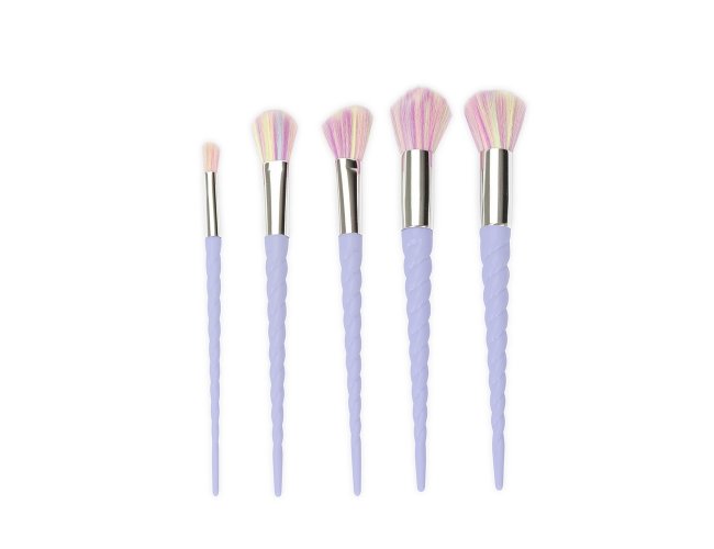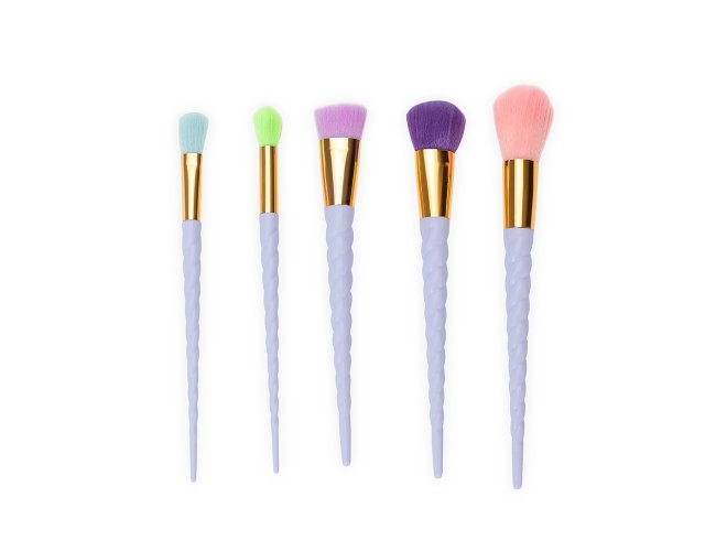 Kit de pincéis com cabos plásticos inspirados no chifre de unicórnio e cerdas sintéticas macias. O conjunto conta com cinco pincéis, incluindo: pincel para aplicação de pó, iluminador, contorno, base e para esfumar.
