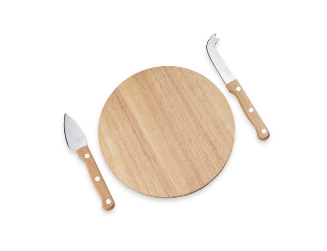 Kit queijo 3 peças em estojo kraft . Contém faca com ponta, faca reta e tábua. Acompanha embalagem de papelão.