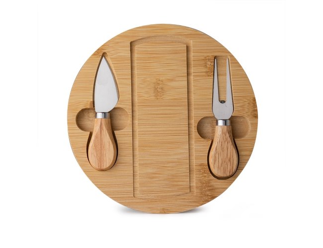 Kit queijo 3 peças, contém: tábua de bambu com canaleta, faca com ponta, garfo e espátula. Tábua com imã para encaixe e fixação dos utensílios.