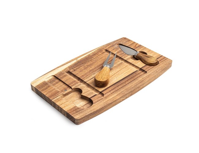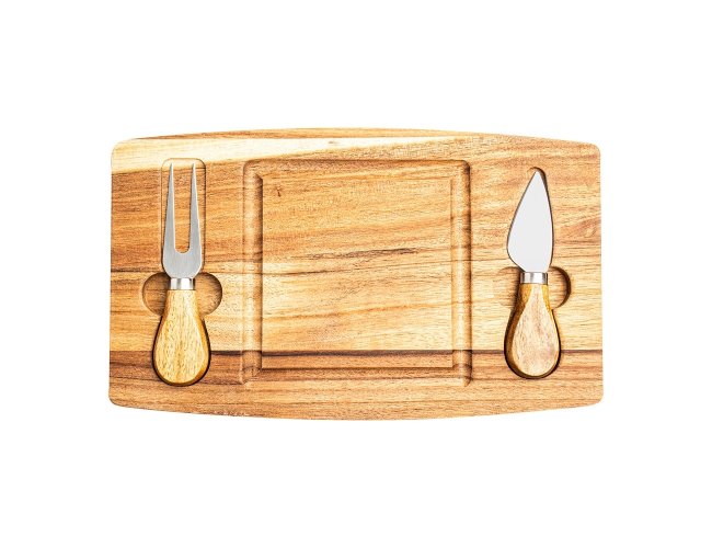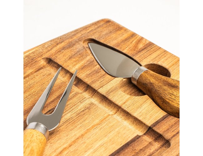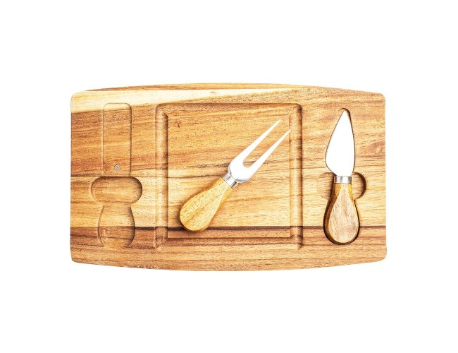 Kit queijo 3 peças, contém: tábua de madeira com canaleta, faca com ponta, e garfo. Tábua com imã para encaixe e fixação dos utensílios.