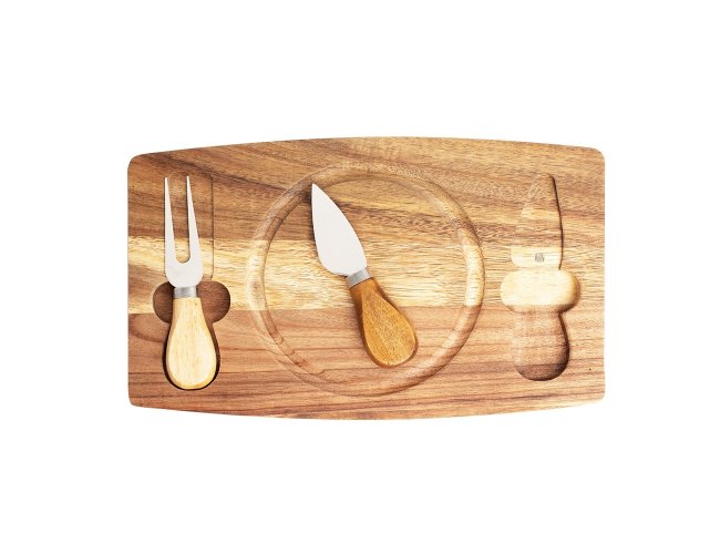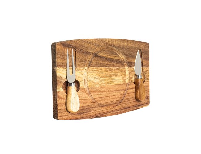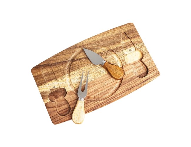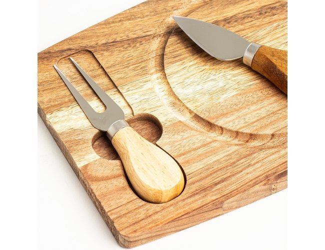 Kit queijo 3 peças, contém: tábua de madeira com canaleta, faca com ponta, e garfo. Tábua com imã para encaixe e fixação dos utensílios.