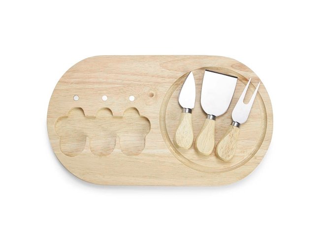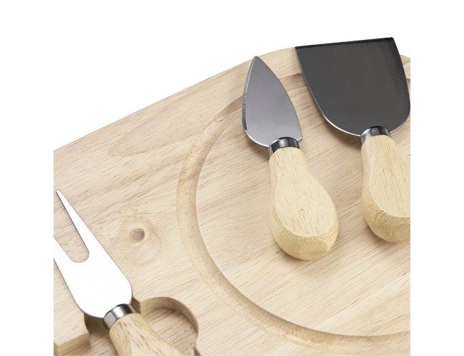 Kit queijo 4 peças, contém: tábua de madeira com canaleta, faca com ponta, garfo e espátula. Tábua com imã para encaixe e fixação dos utensílios.