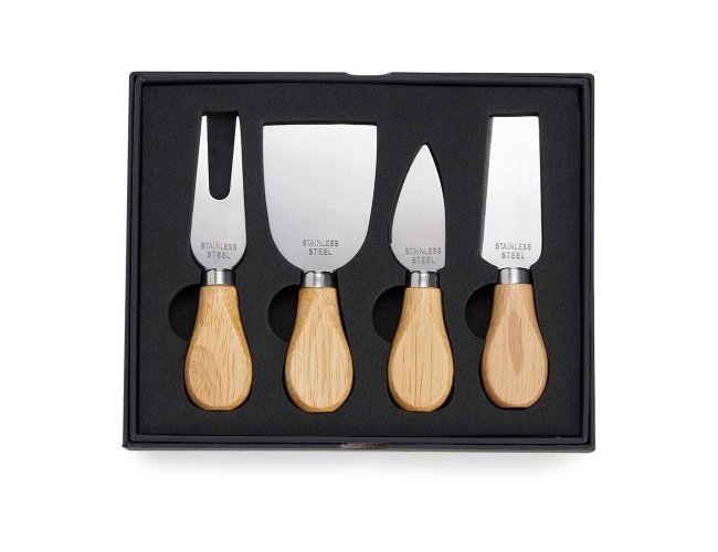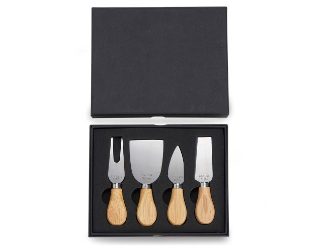 Kit queijo 4 peças em estojo de papelão com berço de espuma, contém: faca com ponta, faca reta, garfo e espátula