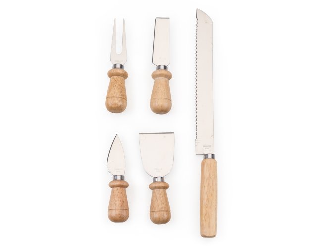 Kit queijo com cinco peças em estojo de papelão. Contém os talheres: faca de serra, faca com ponta, espátula, garfo e faca reta.Parte interna com suporte plástico aveludado com encaixe nas formas dos talheres.