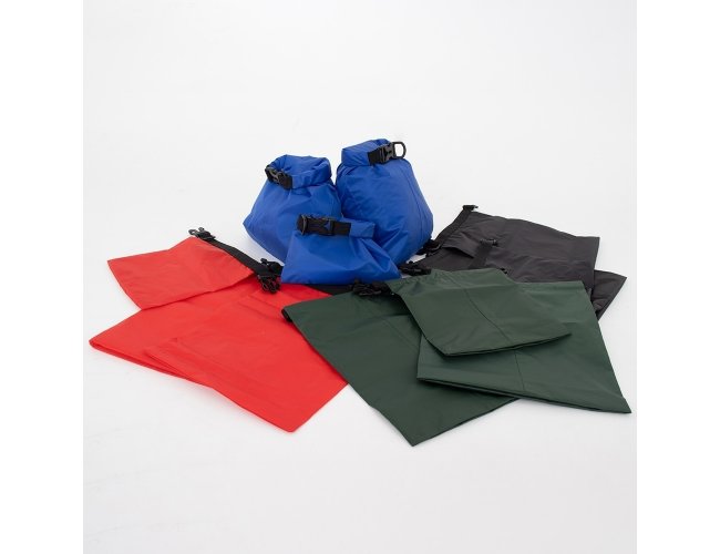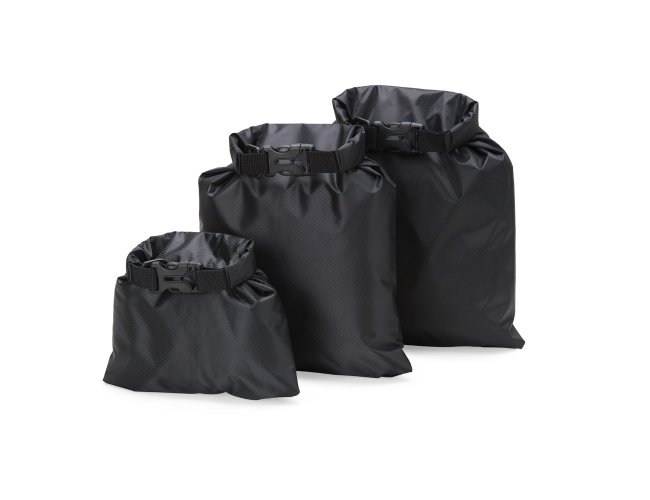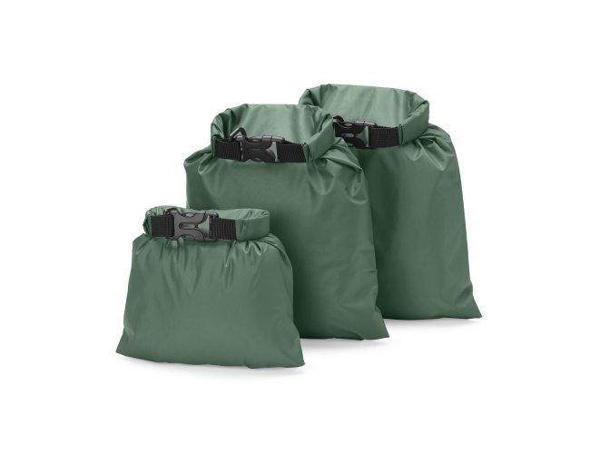 Kit com 3 sacos em nylon impermeável com fechamento por fivelas.