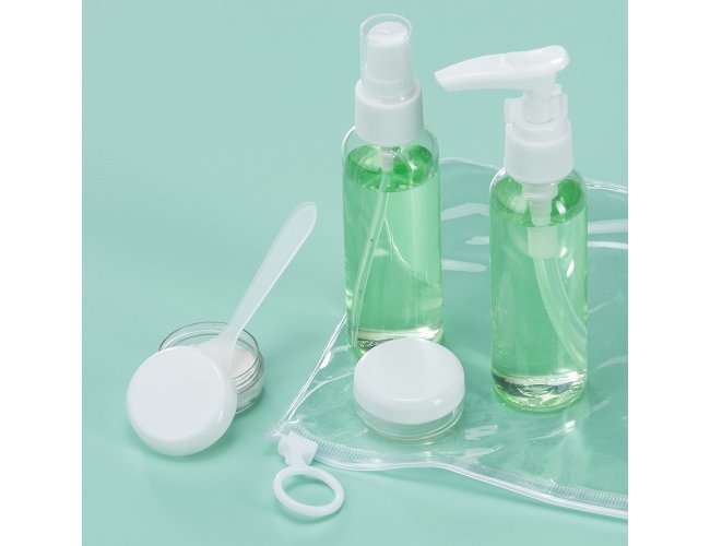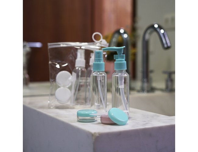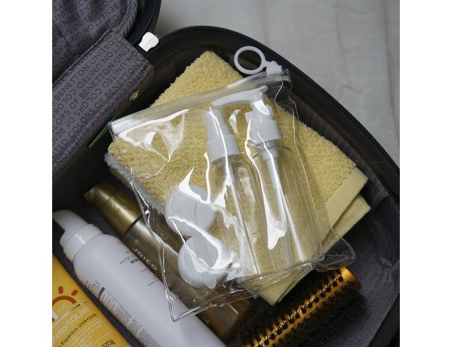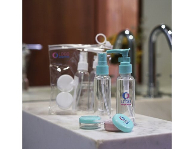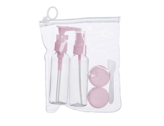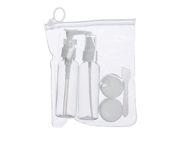 Kit viagem 5 peças em estojo ziplock. Contém frasco de 70ml com tampa spray; frasco de 70 ml com tampa pump; 2 potes de 10ml com tampa rosqueável e mini espátula fosca. Frascos plásticos e estojo em pvc com puxador plástico.