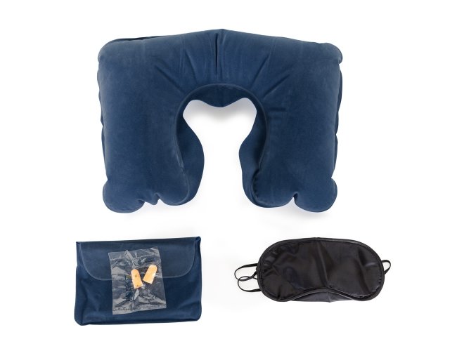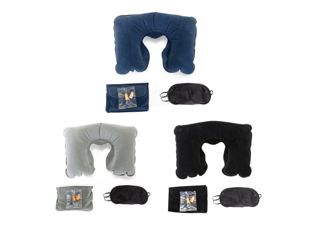Kit viagem com 3 peças, contém: travesseiro inflável(revestido de veludo), máscara para olhos de cetim(revestido com espuma) e um par de protetor auricular. Acompanha uma nécessaire de veludo para guardar o kit.