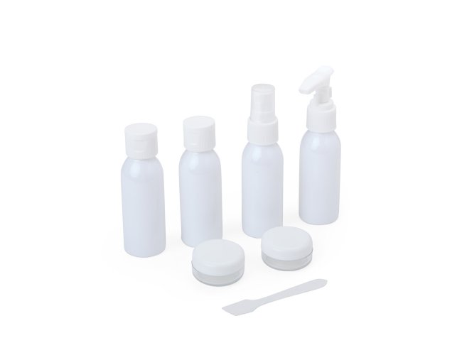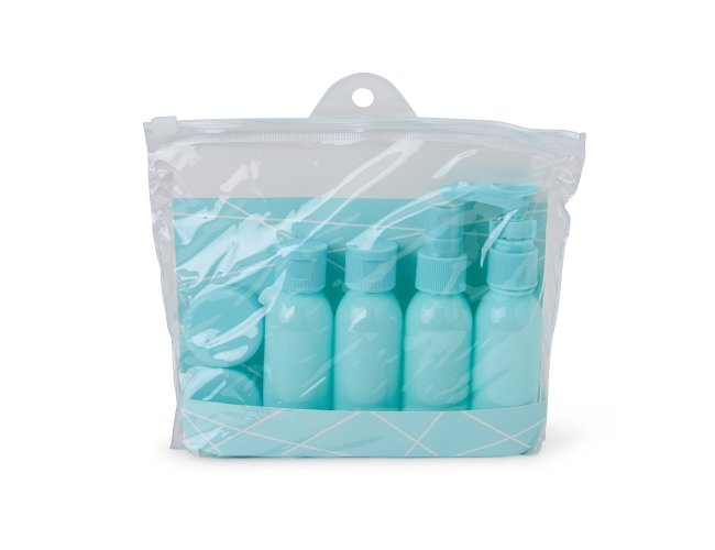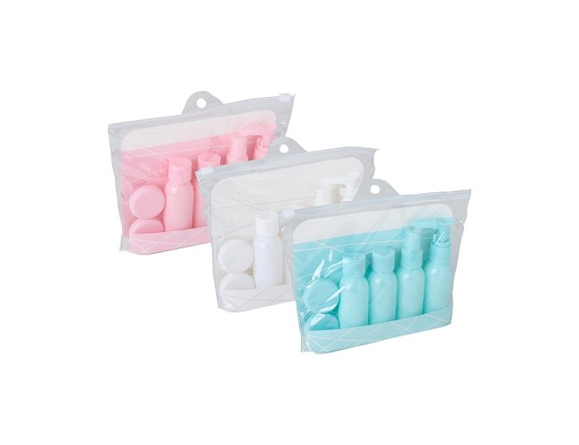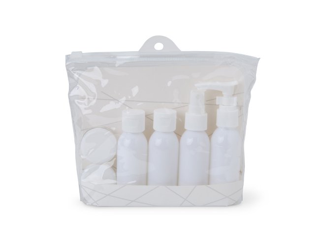 Kit de viagem com seis itens em plástico, incluindo: um frasco pump de 50ml, um frasco spray de 50ml, dois frascos com tampa rosqueável de 50ml e dois pote com 5ml de capacidade. Acompanha estojo ziplock em plástico transparente.