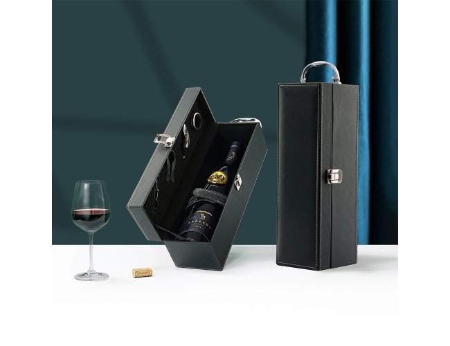 Kit vinho 4 peças em maleta de couro sintético. Contém saca-rolhas metálico, bico condutor com tampa, cortador de lacre e wine colar. Maleta com alça, trava de segurança e parte interna revestida de veludo com área de acomodação para garrafa.