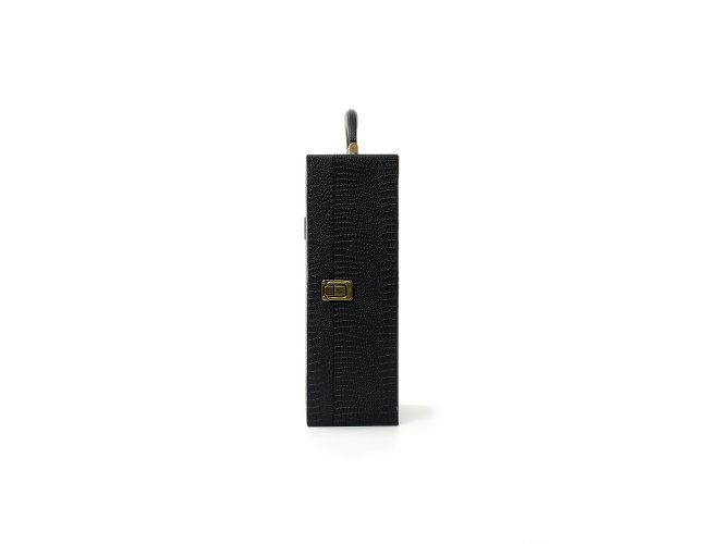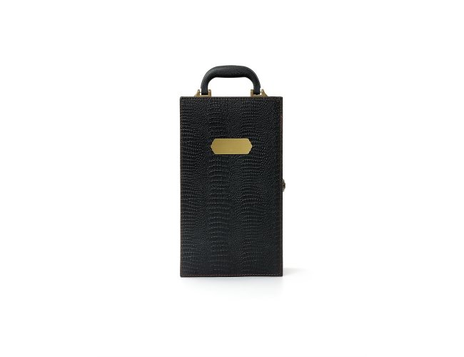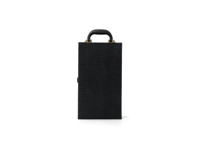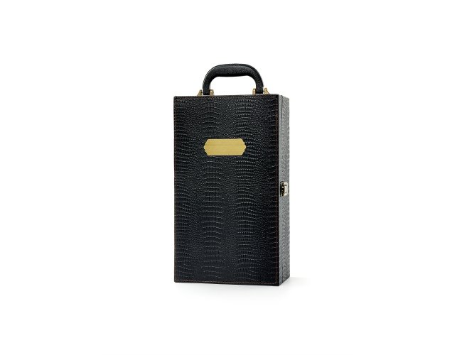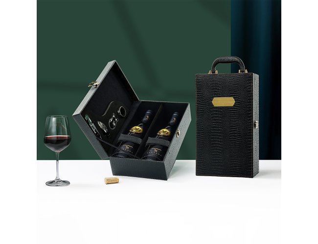 Kit vinho 4 peças em maleta de couro sintético texturizada. Contém saca-rolhas metálico, bico condutor com tampa, cortador de lacre e wine collar. Maleta com alça, trava de segurança e plaquinha plástica fixa. Área interna revestida de veludo com suportes de nylon com velcro e duas repartições para garrafas.