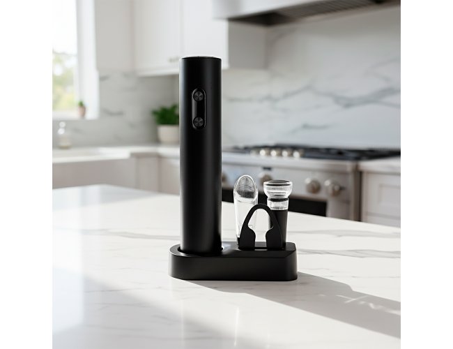 Kit vinho com cinco peças, incluindo: saca-rolhas em plástico e aço carbono com acionamento por botões alimentado por quatro pilhas AA (não inclusas), bico dosador e rolha em plástico e borracha TPR, cortador de lacre e base em plástico.
