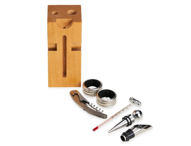 Kit vinho 6 peças em cepo de madeira, contém tampa de bico, bico condutor com tampa, termômetro, dois wine collars e saca rolhas metálico com abridor e lâmina de corte.