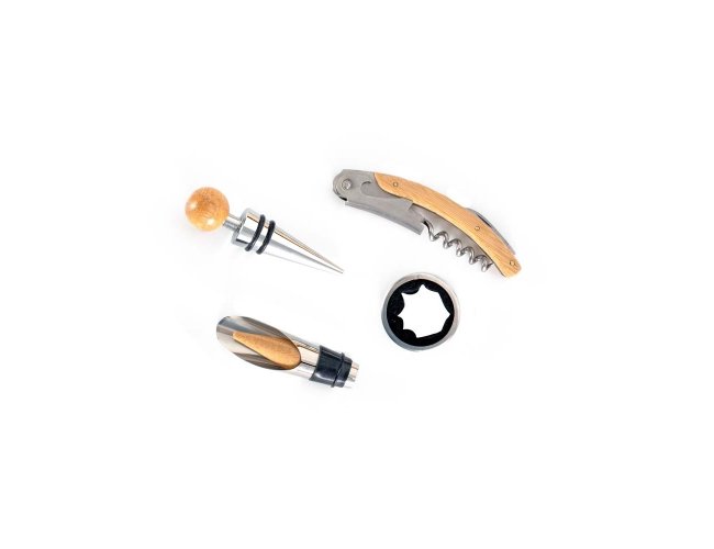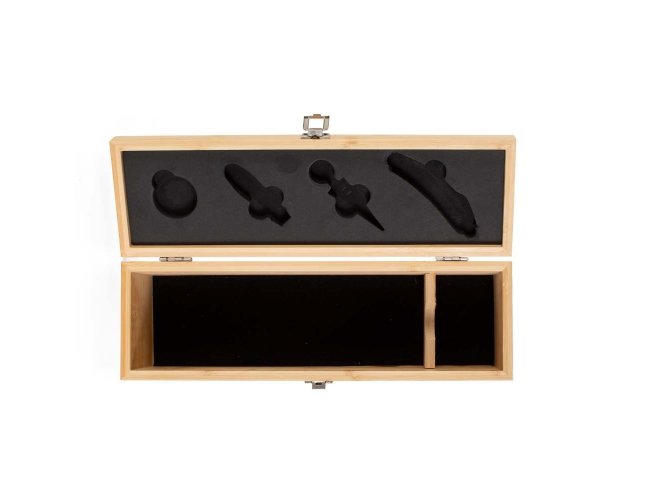 Kit vinho formado por quatro itens em metal com detalhes em bambu, incluindo: um saca-rolhas com lâmina de corte para lacres e abridor de garrafas, uma tampa para bico, um bico dosador com tampa e um anel corta-gotas (wine collar). Acompanha uma caixa em bambu com revestimento em EVA e trava em inox para guardar os itens do conjunto, além de compartimento interno para garrafa de vinho de tamanho padrão.