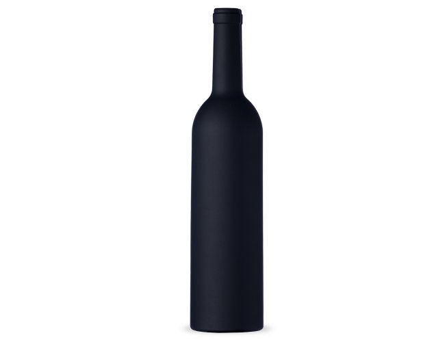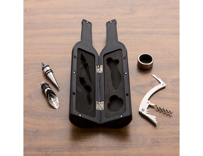Kit vinho formato garrafa com 4 peças: tampa de bico, bico condutor com tampa, saca-rolhas metálico com lâmina de corte e abridor de garrafa e wine collar. Estojo com fechamento imantado e área interna com berço de espuma.