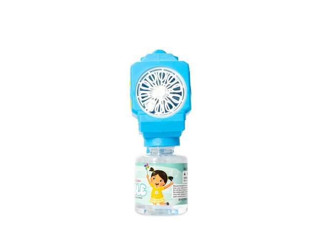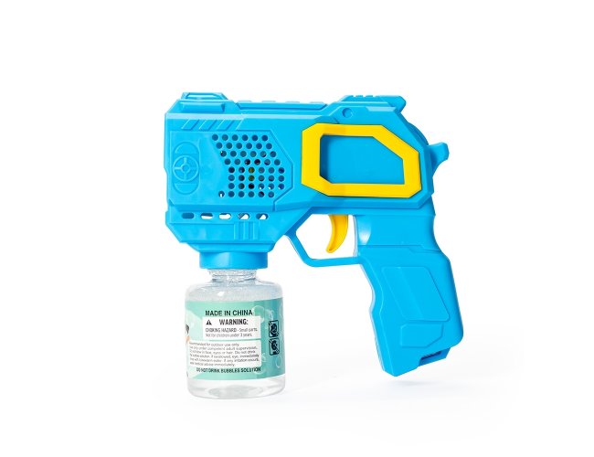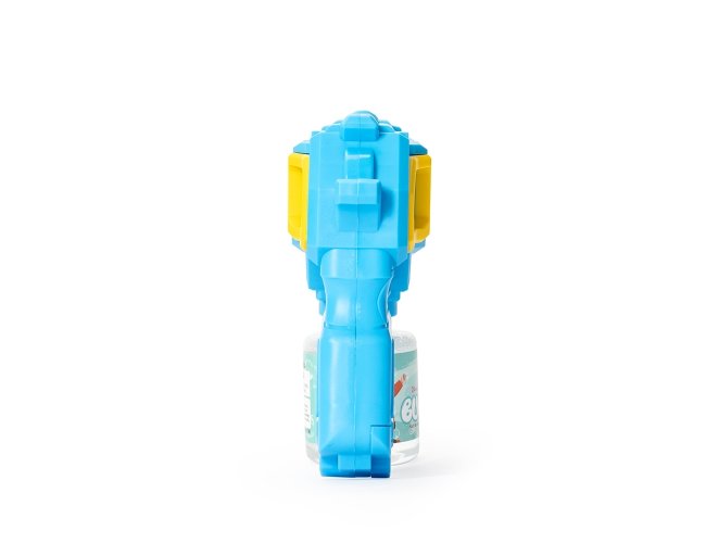 Brinquedo lançador de bolhas de sabão feito em plástico. Ao acionar o gatilho, dispara múltiplas bolhas de uma só vez. Funciona com quatro pilhas AA (não inclusas) e acompanha frasco com líquido para formar bolhas e adesivos para decoração.