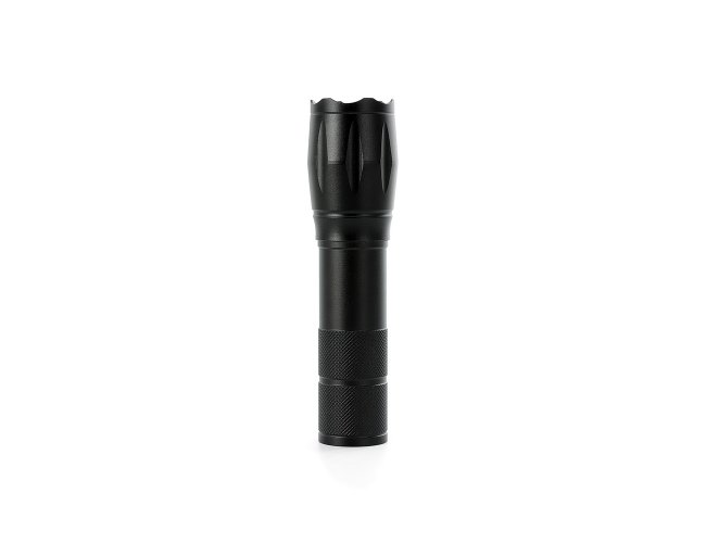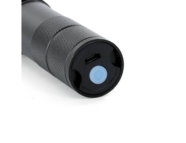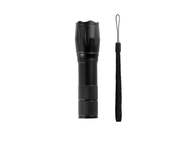 Lanterna led recarregável com zoom de regulagem e três estágios de iluminação, material metálico. Acompanha cordão de nylon e cabo USB-V8.