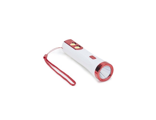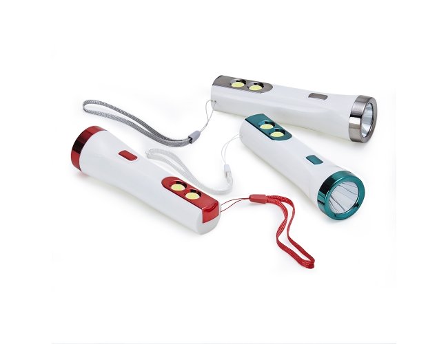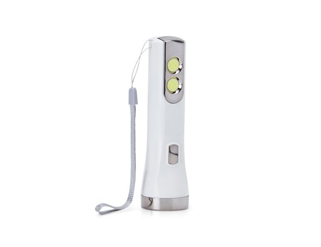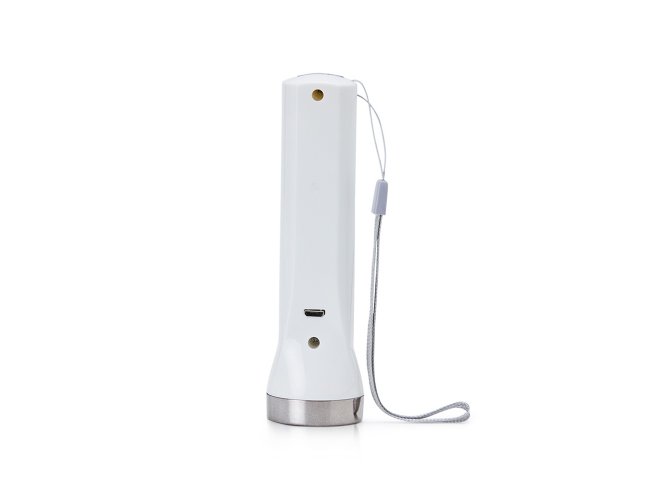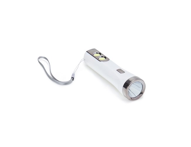 Lanterna plástica recarregável de um led com 3 estágios de iluminação e dois leds lateriais com função luminária. Possui cordão de nylon para transporte e acompanha cabo usb.
