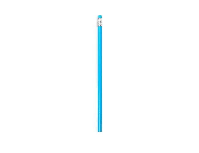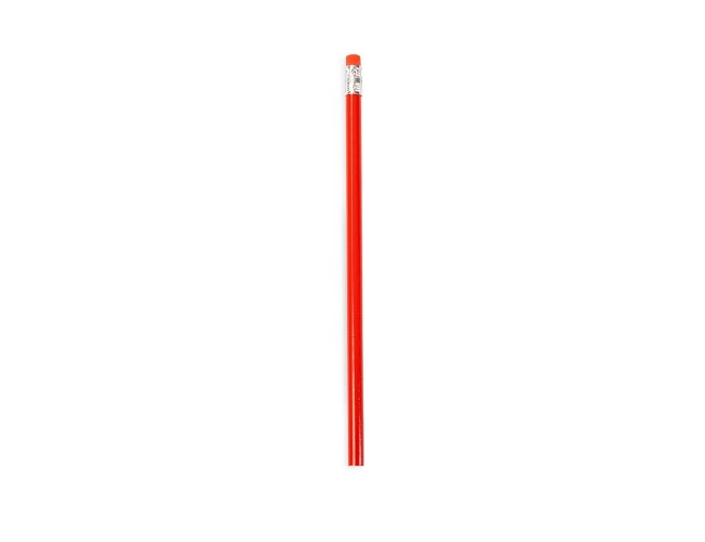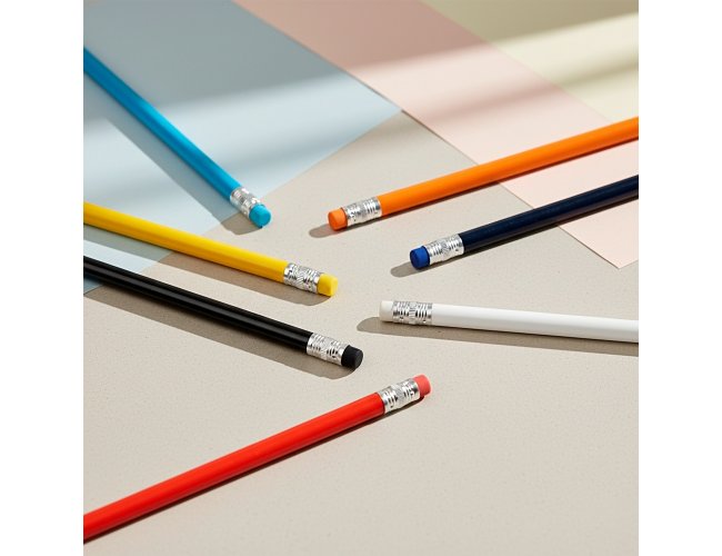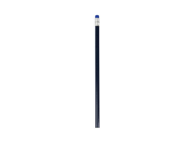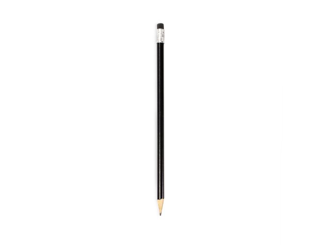 Lápis sem ponta feito em madeira com grafite preto, guarnição em metal e borracha na extremidade oposta.