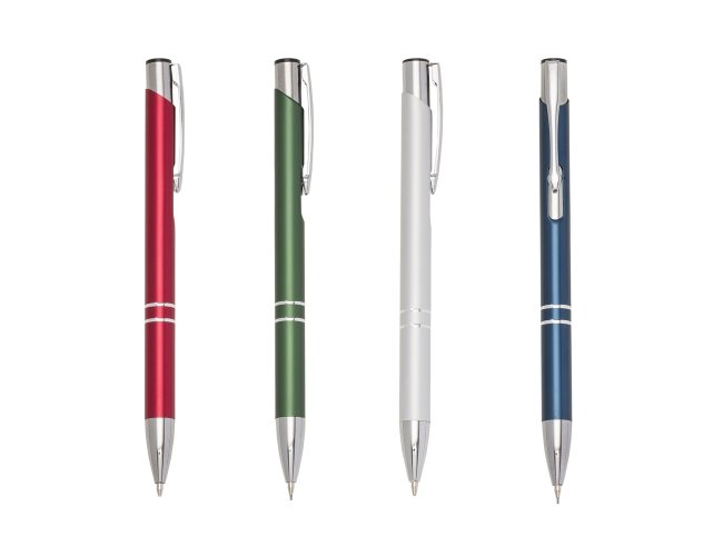 Lapiseira metal inteira colorida com detalhes prata. Clip metal com a ponta do acionador preto, parte inferior com dois anéis prata. Aciona por clique.