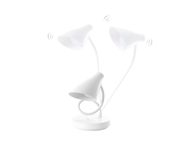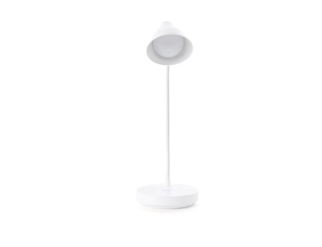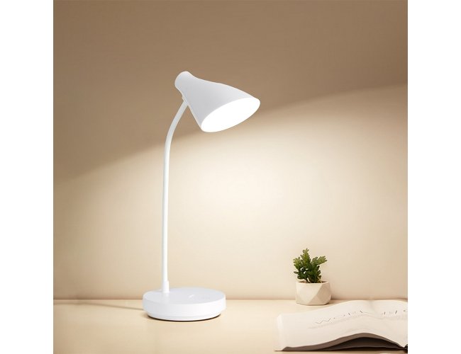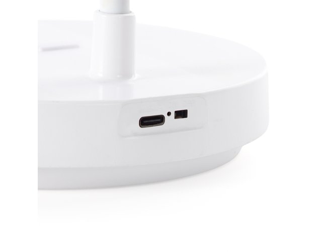 Luminária articulável em led recarregável e funcionamento touch, material plástico. Contém três estágios de iluminação com regulagem de intensidade touch: luz fria (branca), luz quente (amarela) e luz mista (branca e amarela). Base com botão para ligar e desligar. Acompanha uma bateria de lítio e cabo USB Tio-C para carregamento.