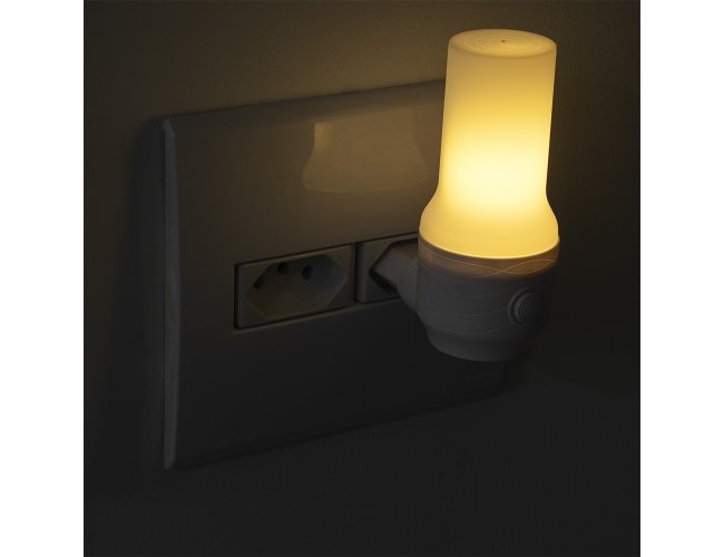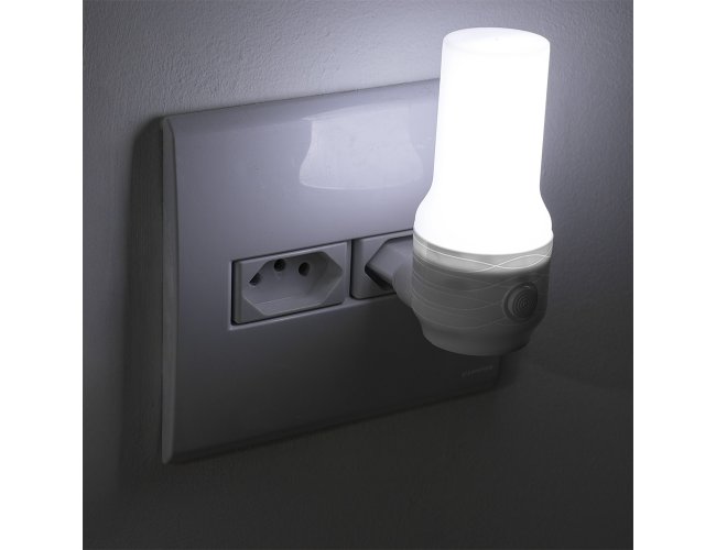 Luminária de tomada de estrutura plástica, iluminação em LED e voltagem de 220V, oferecendo luz ao ambiente com baixo consumo de energia. Conta ainda com um botão que permite alternar entre as tonalidades amarela e branca.