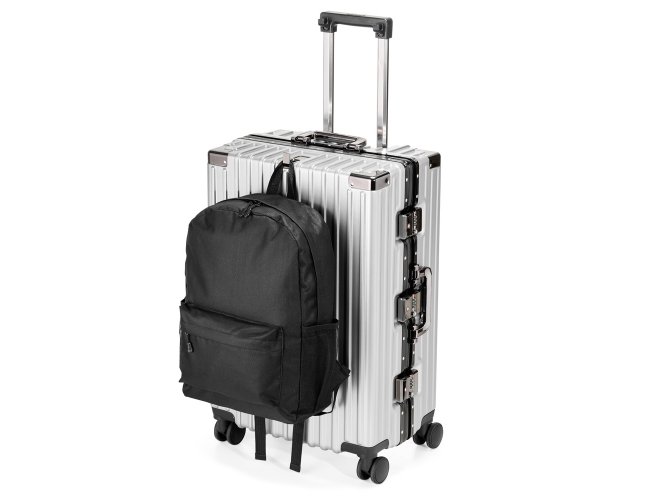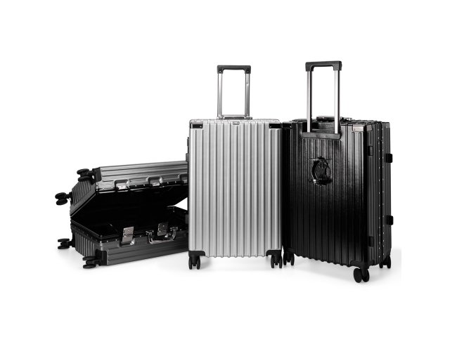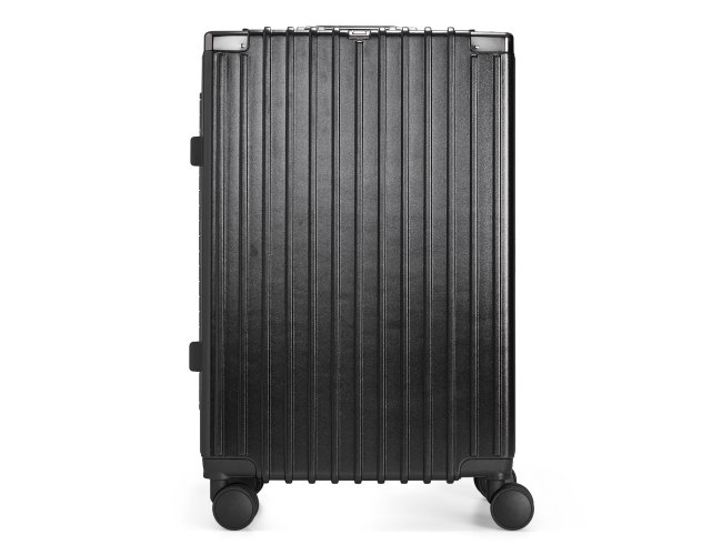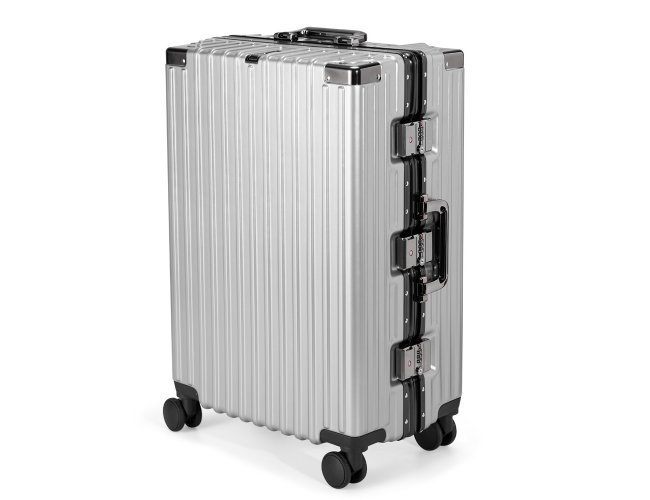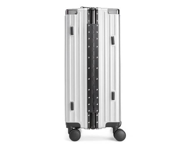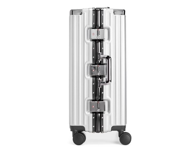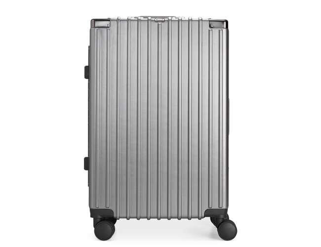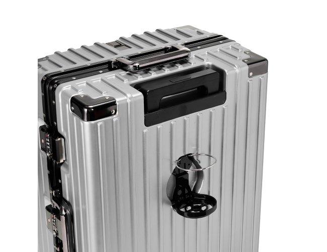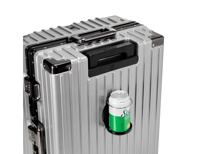 Mala de viagem 77 litros feita em plástico com acabamento em alumínio, contém cadeado numérico TSA. Compartimentos internos com bolso telado, bolso plástico para itens molhados e cinta compressora para roupas. A mala possui duas alças de mãos, puxador retrátil com regulagem de tamanho e suporte para celular, suporte porta bolsa, suporte para copo ou garrafa, quatro rodinhas 360º e apoios laterais.