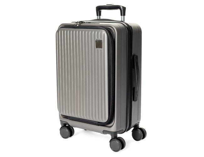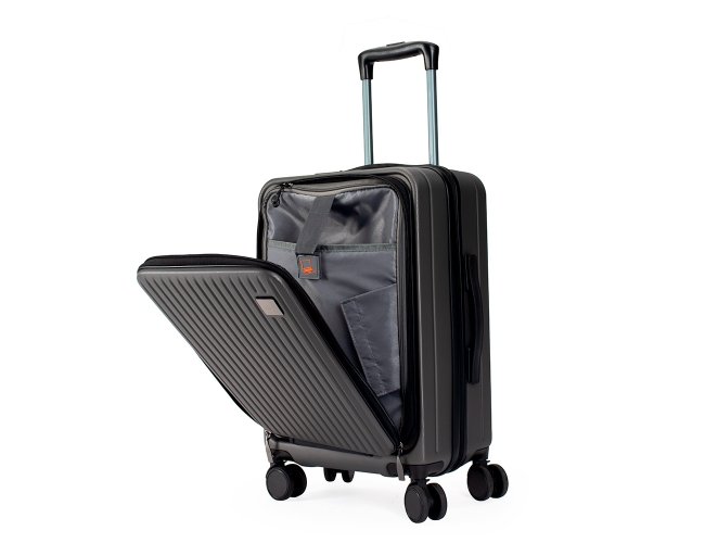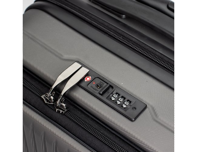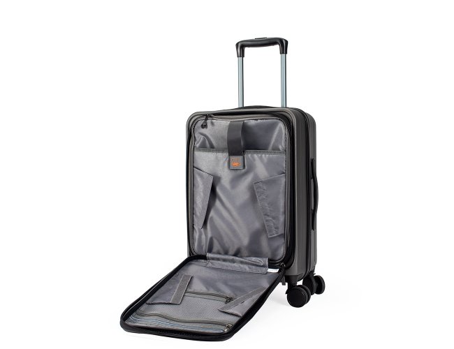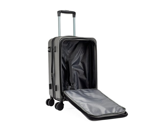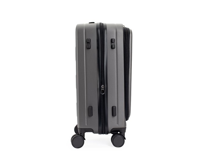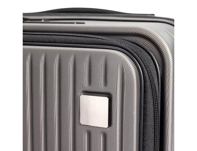 Mala de viagem feita em ABS com capacidade de até 33 litros quando o zíper externo de expansão é aberto. Possui abertura frontal com bolsos de zíperes, uma divisória para notebooks de até 15,6 polegadas e cinta compressora para roupas. Conta ainda com cadeado TSA embutido na parte superior, quatro rodinhas giratórias 360°, duas alças de mão, além de apoios e ganchos laterais. Acompanha placa metálica personalizável.
