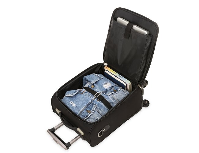 Mala de viagem com padrão para bagagem de mão, conforme especificações IATA (Associação Internacional de Transportes Aéreos). Confeccionada em nylon de alta qualidade, possui alça de mão emborrachada, puxador retrátil com botão acionador, sistema com 4 rodas multidirecionais, compartimento frontal de zíper com divisória para documentos e canetas e compartimento principal com bolso para notebook até 13.3 polegadas. A parte interna conta com um sistema organizatório através de uma alça de nylon ajustável, quando utilizada impede que as roupas se movimentem dentro da mala durante o transporte. Acompanha alças de nylon com encaixe de mosquetão (removíveis).