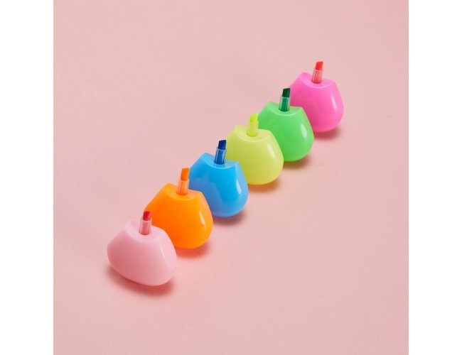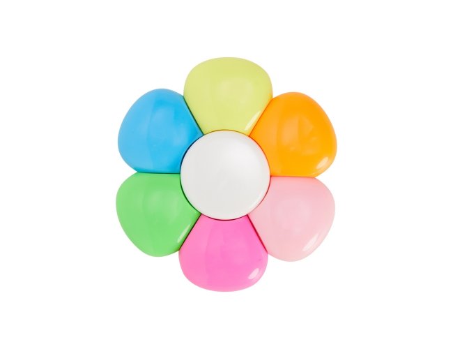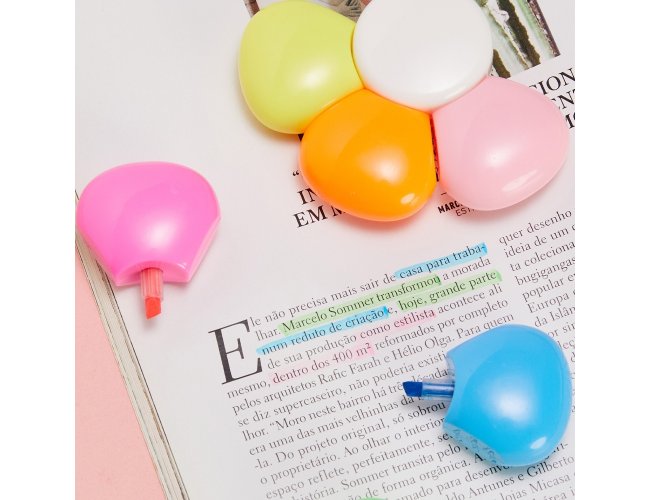 Caneta marca texto em formato Flor na cor branca de frente e verso liso, possui as cores: azul, verde, rosa, amarelo, laranja e rosa escuro.