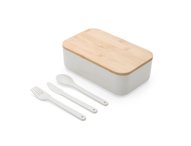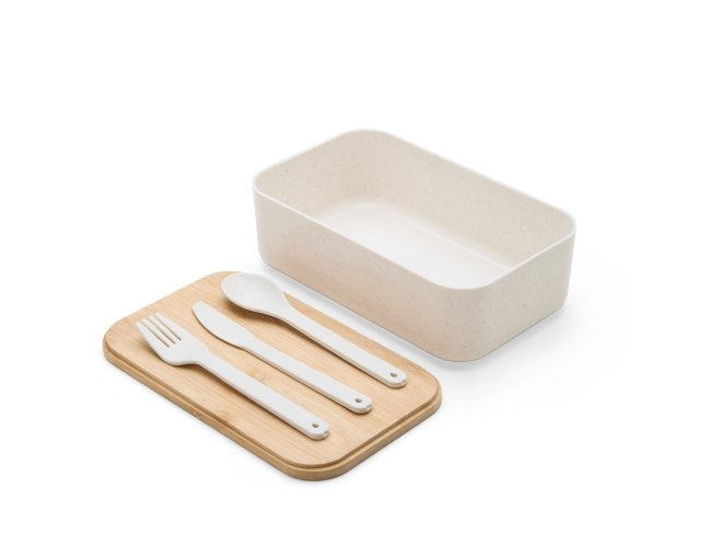 Marmita em fibra de trigo com tampa de bambu de 1 litro. Possui elástico para um transporte seguro. Acompanha garfo, faca e colher. Obs: O tempo de aquecimento no micro-ondas não deve ultrapassar 3 minutos.