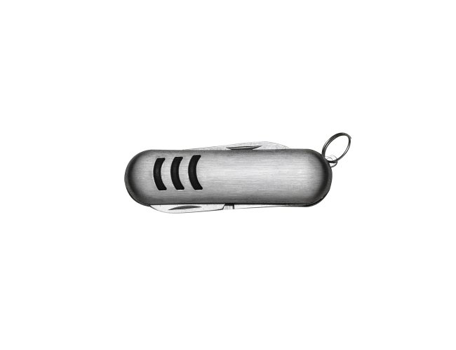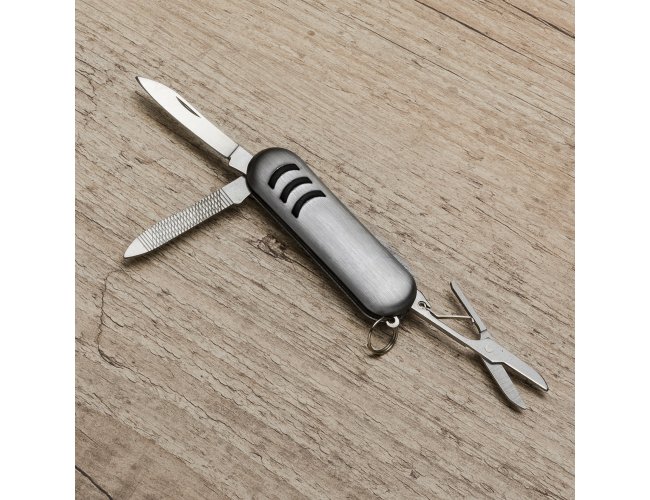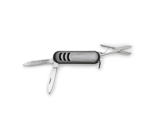 Mini canivete metal 3 funções com detalhes emborrachados preto(três linhas frente e verso). Possui: lixa, lâmina de corte e mini tesoura e acompanha pequena argola para utilizar como chaveiro.