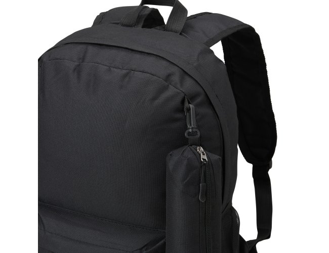 Mochila de nylon de 27 litros com dois compartimentos, sendo um bolso raso para notebook de 15,6 polegadas e bolsos laterais telados. Acompanha estojo de nylon.
