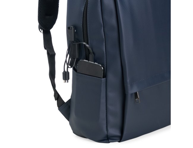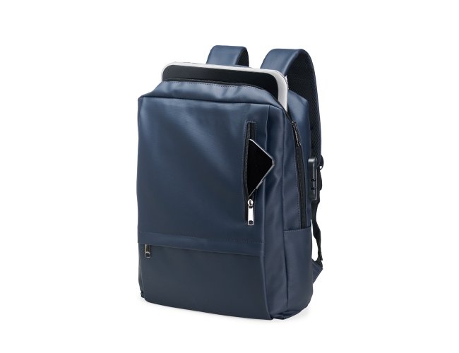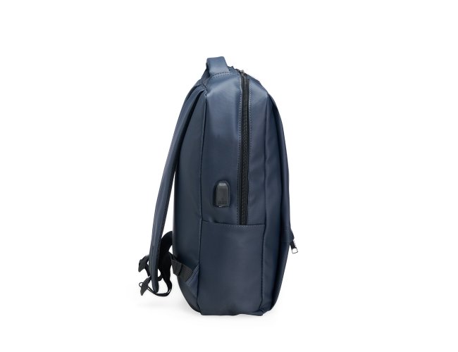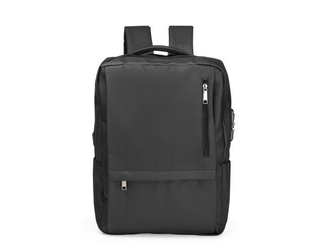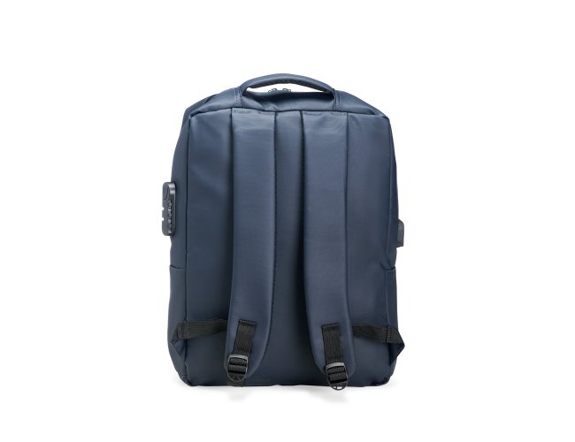 Mochila em Oxford impermeável com capacidade para até 22 litros. Possui compartimento interno com divisória para notebooks de até 15,6 polegadas, além de dois bolsos frontais com fechamento em zíper e mais um par de bolsos laterais abertos. Conta ainda com suporte externo USB, cadeado numérico e alças de mão e de costas com revestimento acolchoado.