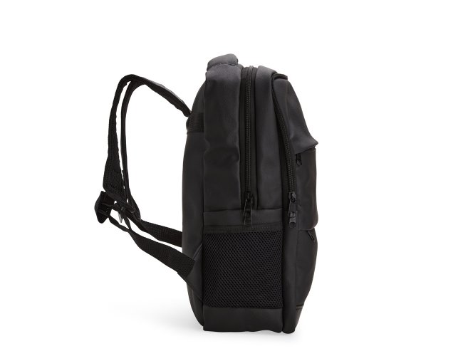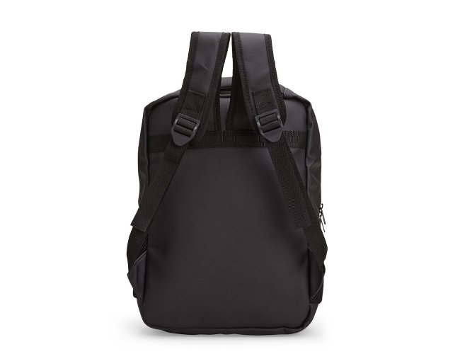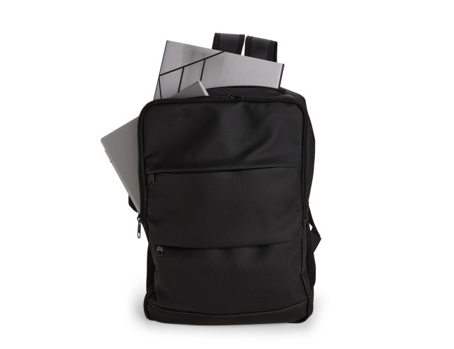 Mochila confeccionada em couro sintético com capacidade máxima de 20 litros. Possui compartimento principal com divisória em malha para notebooks de até 15,6 polegadas. Conta ainda com três compartimentos frontais em tamanhos diferentes, além de dois bolsos em tecido respirável, o mesmo material de revestimento das alças para as costas e alça superior de mão.