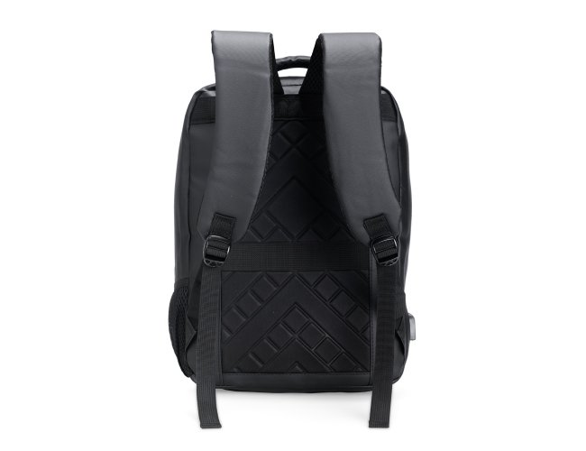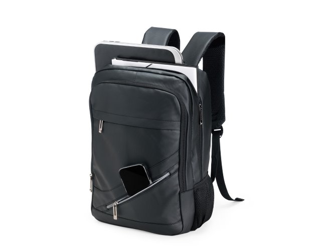 Mochila em couro sintético impermeável com capacidade máxima de 26 litros. Possui compartimento principal com divisória para notebook de até 15,6 polegadas, além de dois compartimentos frontais em tamanhos diferentes, bolso lateral em malha com elástico e suporte USB. Conta ainda com alça de mão e duas alças para as costas com revestimento em tecido respirável.