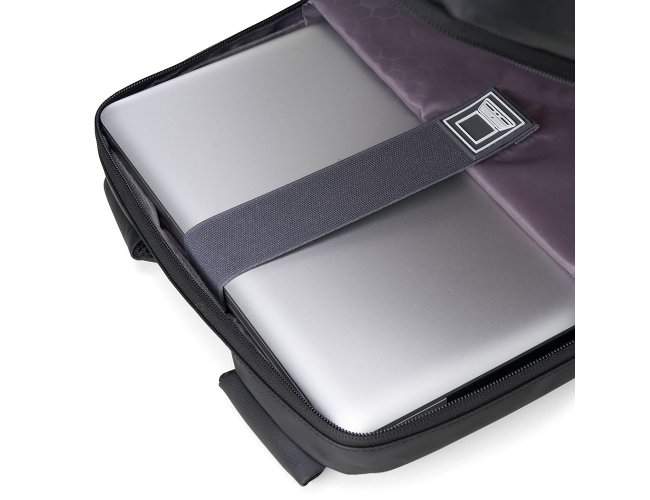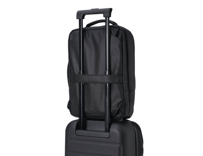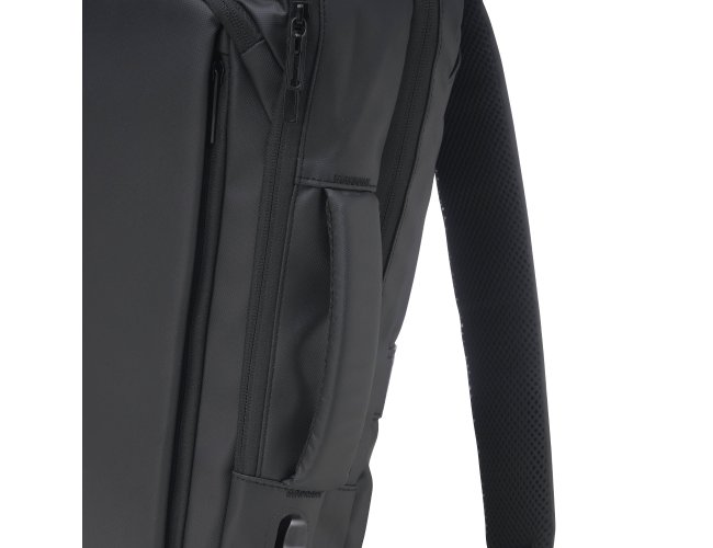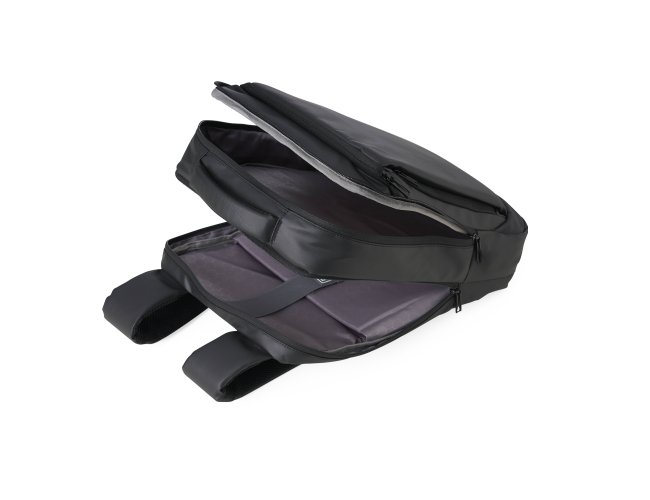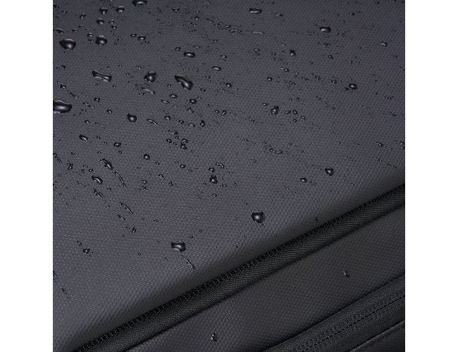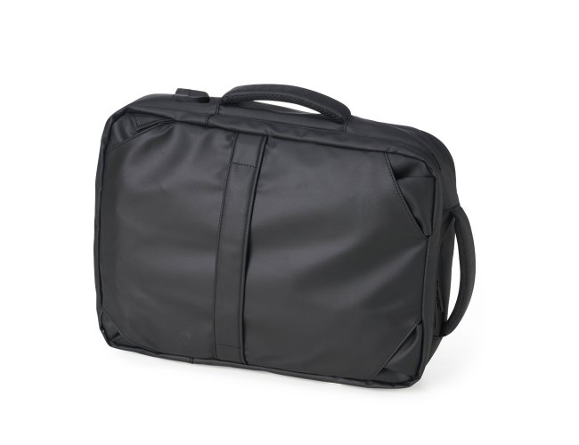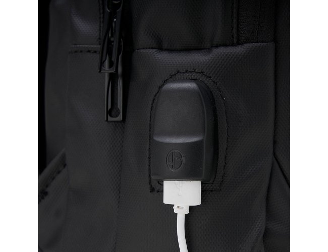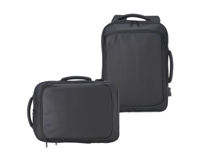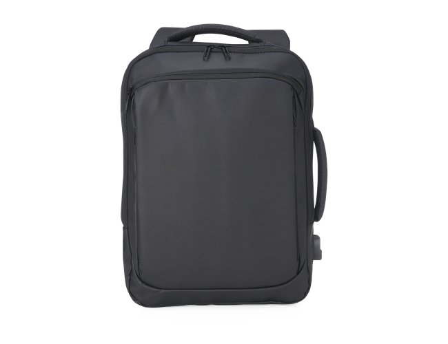 Mochila em couro sintético 17 litros resistente à água com cinco compartimentos, sendo o principal com bolso para notebook 15,6. Com divisórias internas para acessórios, a mochila possui suporte externo usb, alça para encaixe em malas de viagem e duas alças de mãos, sendo uma delas lateral para o transporte da mochila no modo pasta.