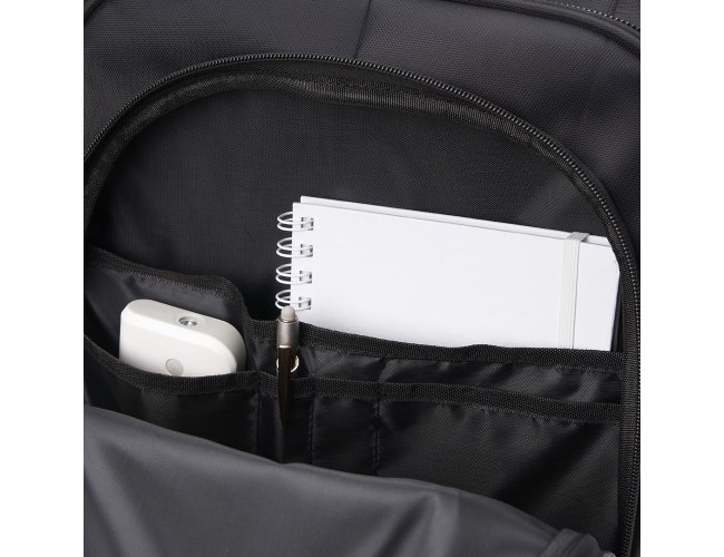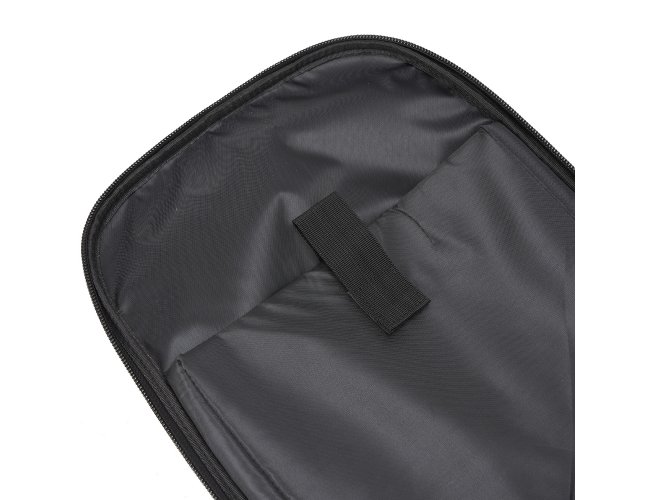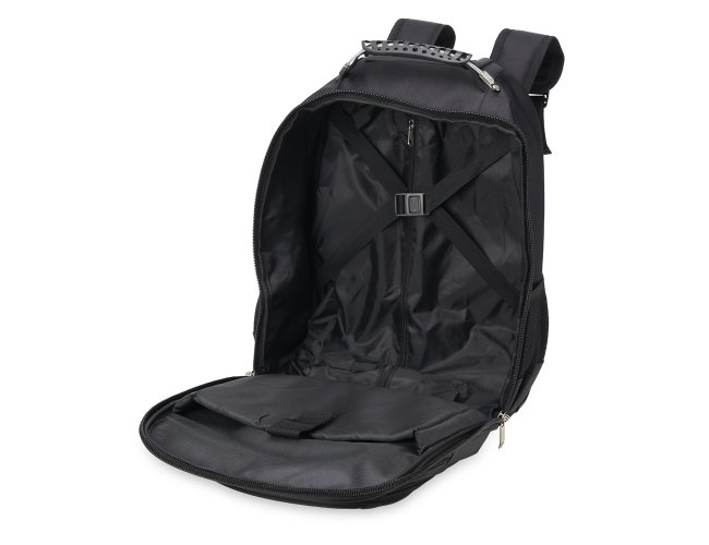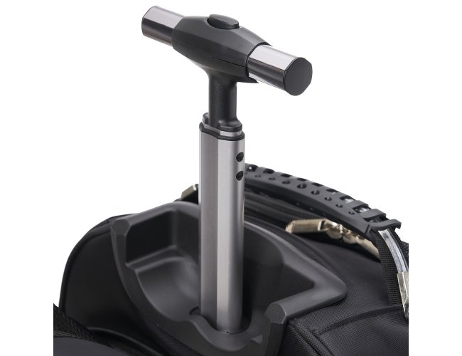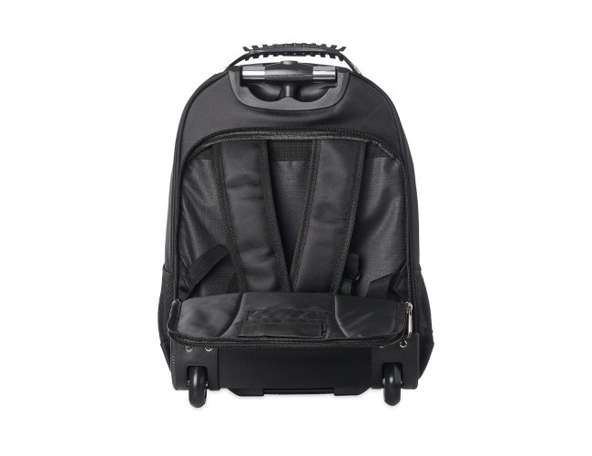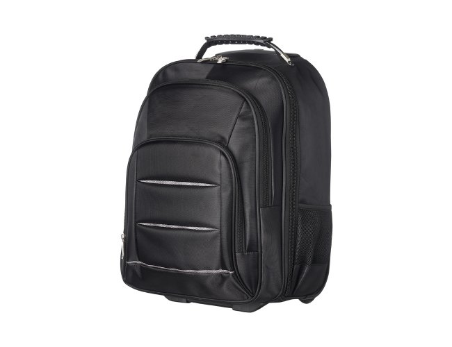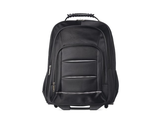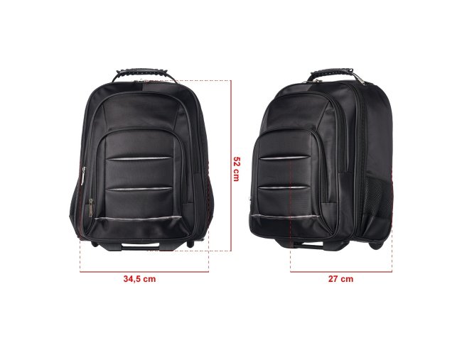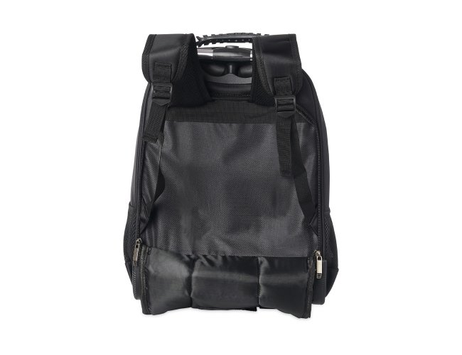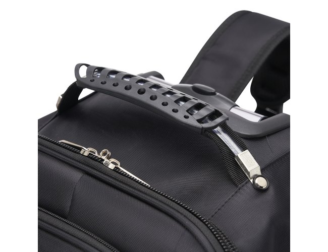 Mochila de carrinho 38 litros com padrão para bagagem de mão, conforme especificações IATA (Associação Internacional de Transportes Aéreos). Confeccionada em nylon, contém alça de mão com pegador emborrachado com cabo de aço interno para garantir maior resistência, puxador retrátil com regulagem e botão acionador, alças para as costas escondidas no compartimento traseiro com zíper, compartimento mediano com divisórias para documentos e canetas, compartimento frontal pequeno e bolsos laterais em malha. O compartimento principal possui bolso para notebook até 13.3 polegadas e forro com zíper. Possui duas rodinhas e freio em plástico, além de um sistema velcro para junção do compartimento das alças com a parte inferior, tampando as rodinhas enquanto transporta a mochila nas costas.