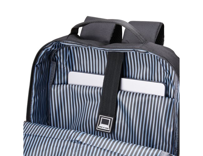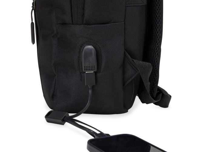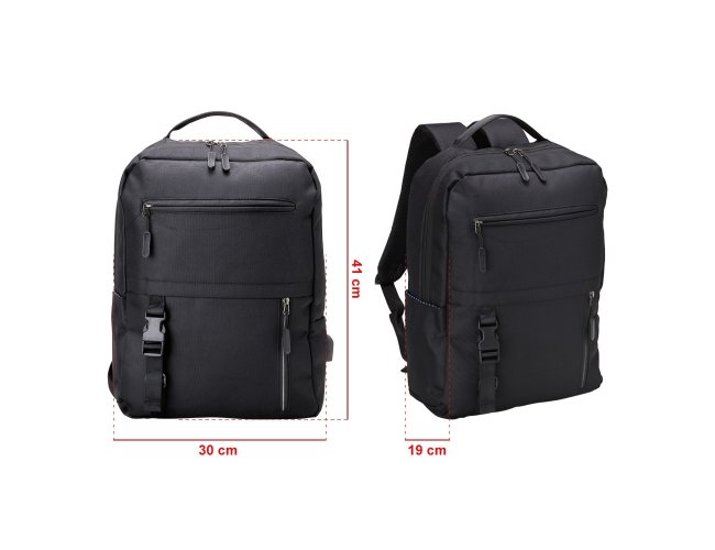 Mochila de nylon 22 Litros com 3 compartimentos, sendo o principal com bolso para notebook 15,6. Com divisórias internas para acessórios, a mochila possui bolso lateral, suporte externo USB e alça para encaixe em malas de viagens.