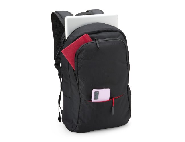 Mochila feita de nylon, com tecido resistente a água e até 24 litros de capacidade em seu interior. Possui 3 compartimentos, sendo o principal com bolso para notebook de até 17 polegadas. Com divisórias internas para acessórios, a mochila possui 1 bolso lateral e alça para encaixe em malas de viagens.