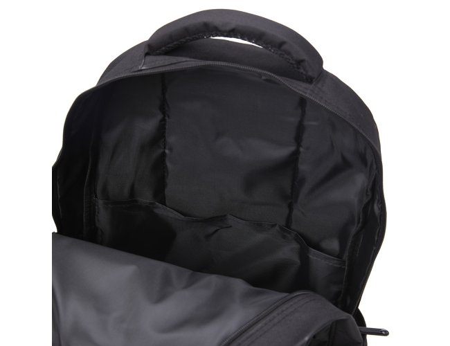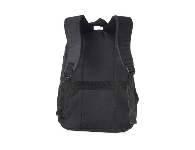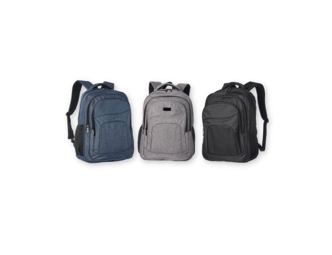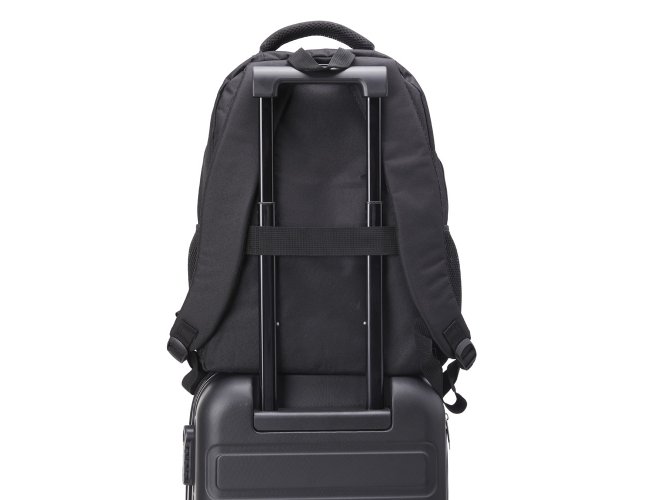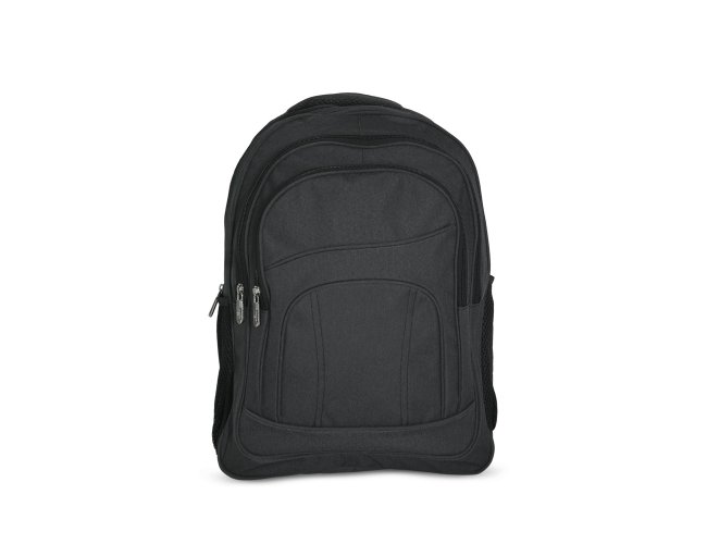 Mochila de nylon 30 litros com três compartimentos, sendo o principal com bolso para notebook 15,6.Com bolsos laterais telados, a mochila possui alça para encaixe em malas de viagem, duas alças de mãos e alças para as costas com revestimento espumado. Acompanha plaquinha metálica.